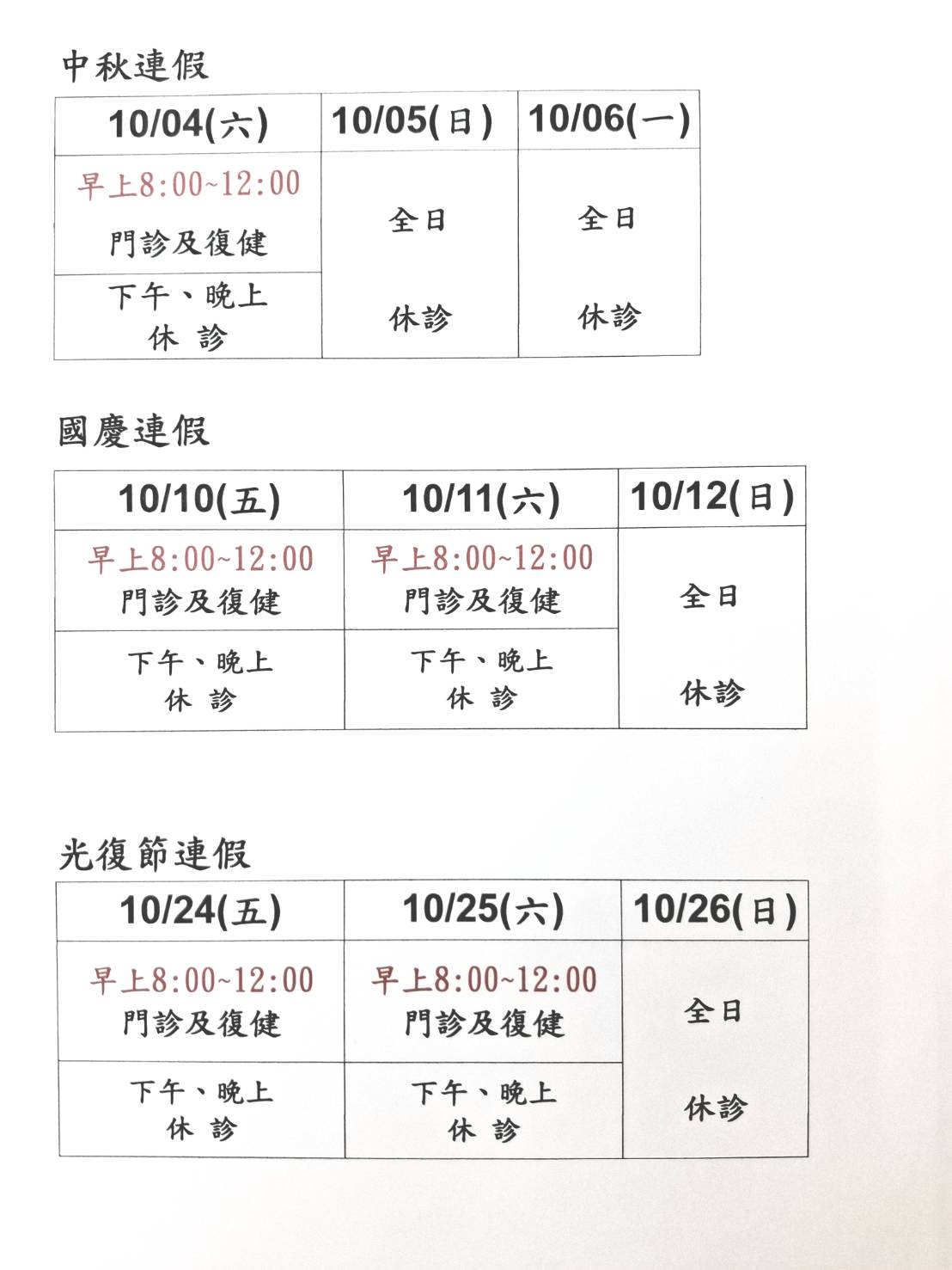 | 復健治療 | 一 | 二 | 三 | 四 | 五 | 六 | 日 |